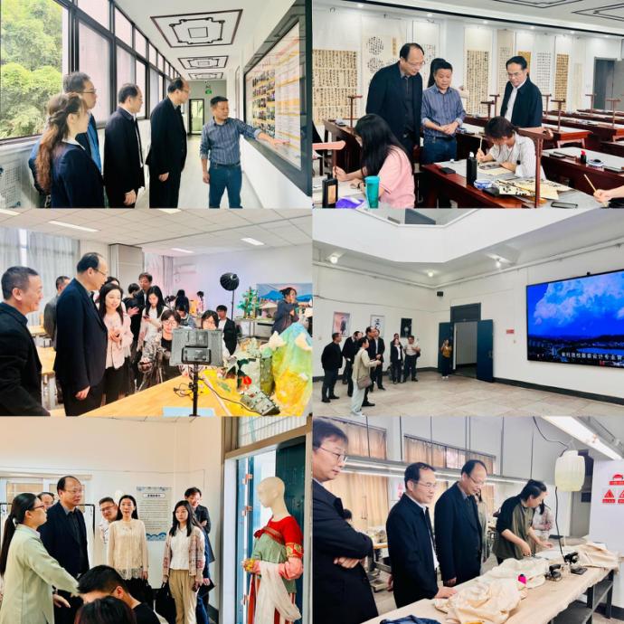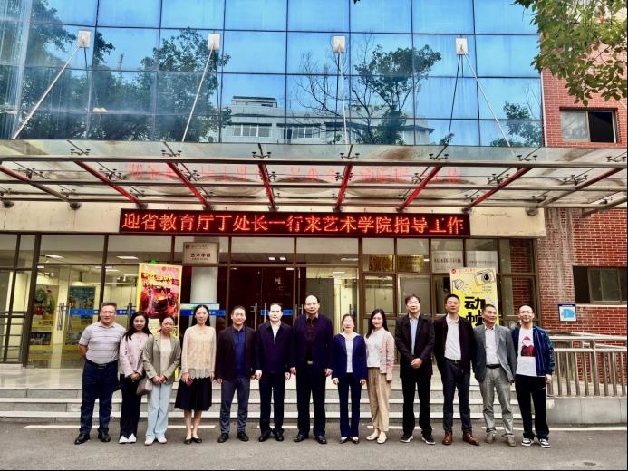 本网消息 10月13日,省教育厅艺体处处长丁雪峰,省教育厅艺体处科长许萍、陈蓓来金莎4399网址no1调研指导美育工作。涂立桥副校长、校团委书记高飞、师范学院院长胡邦岳、艺术学院院长刘满中,以及书法研究中心、学生艺术实践工作坊相关负责人陪同调研。