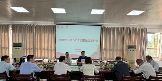 座谈会上,机电工程学院院长陶晶代表学院全体教职工对贾恩涛的到来表示热烈欢迎,他详细介绍了学院的创办历史、开设专业、实践创新平台和教学成果等相关的内容。他指出,在国家创新驱动发展战略的新形势下,机电工程学院高度重视创新创业教育工作,充分利用湖北省机电基础实验教学示范中心、湖北省机电系统虚拟仿真实验教学中心、智能输送技术与装备湖北省重点实验室、合作企业等多渠道创新、创业教育资源,发挥机械电子工程湖北省级一流专业建设点优势,形成了多方协同育人的教育合作机制。